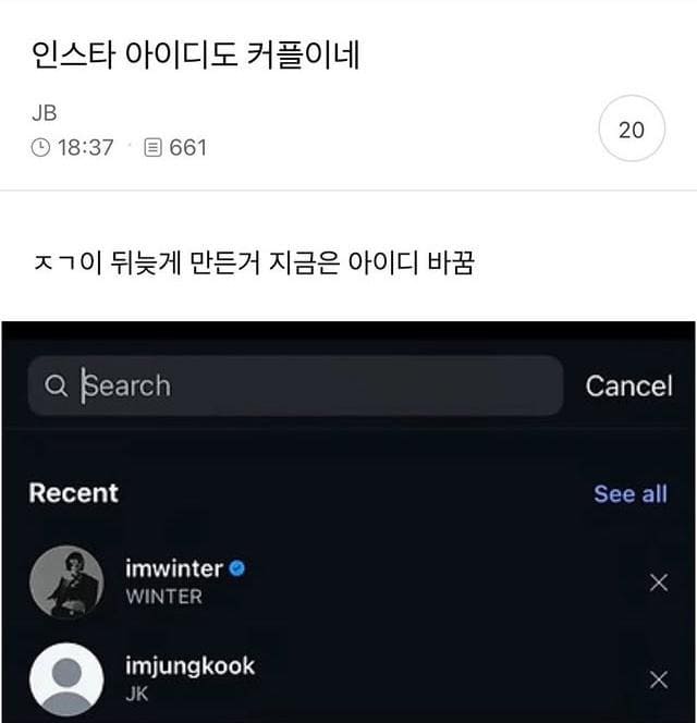 정국의 과거 인스타그램 계정명도 다시 주목받고 있습니다. 현재 정국이 상용하고 있는 아이디 'mnijungkook'에서 n과 i의 순서를 바꾸면 'minjungkook'이 되며, 이는 윈터의 본명 '김민정'과 연관이 있다고 추측하고 있습니다.